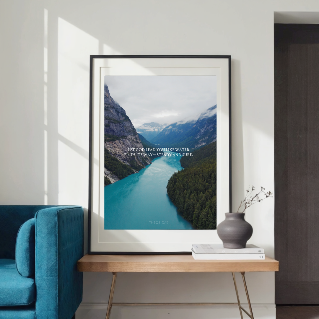 A turquoise glacial river winds gently through a wild valley at dawn. Led Like Water by Theos Dae captures the quiet, certain way God guides us forward. This print brings a refreshing sense of flow, movement, and peace to any room.